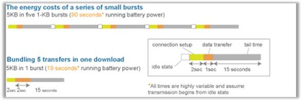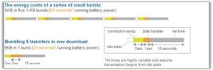 The researchers point out that it is more efficient to utilize fewer connections to send more data per connection. For example: 5 connections of 1 KB each utilize 90 seconds of radio, while one 5 KB transfer uses 19 seconds (a 79% decrease in battery usage for the same amount of data!).