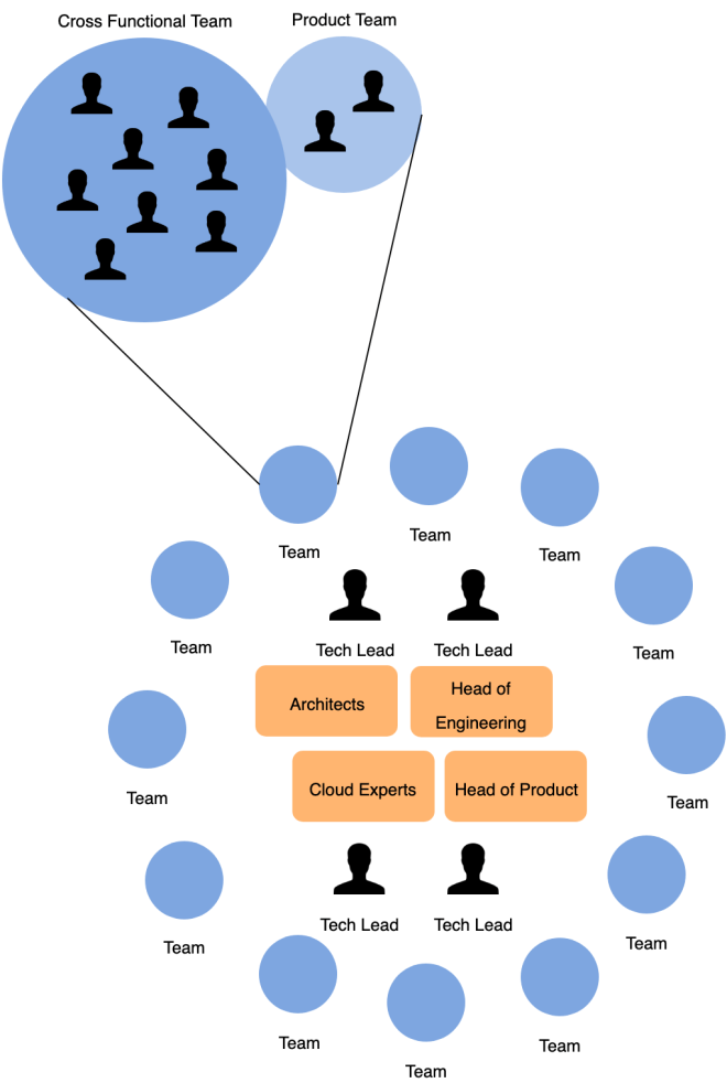 Obviously, this team cannot (and shouldn’t!) be compared to a remote island where any decision is taken locally, these teams have to collaborate with the rest of the organization using services like architects, cloud experts and other functions inside the organization following the boundaries created by the heads of the technical department.